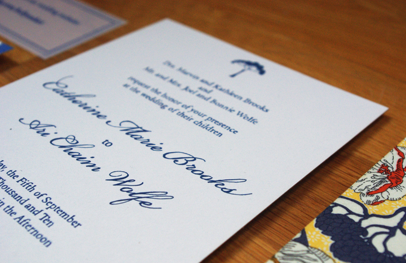 Full suite includes wedding invitation backed with Liberty of London printed cotton, reply postcard, website information, and envelope.