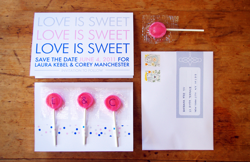 S A V E _ T H E _ D A T E digital printing Folded card with labelled lollipops and custom tape. Envelopes with wrapped address stickers. © 2010 Pounding Mill Press | Based in Oakland CA | Contact us at info at poundingmillpress.com