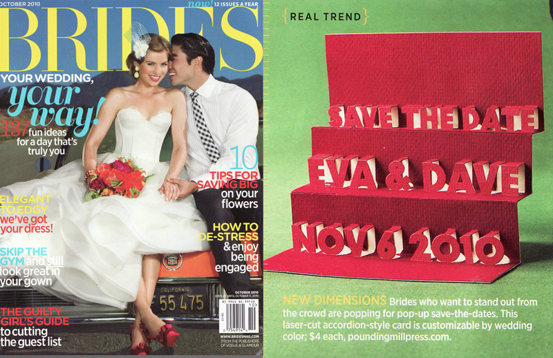 Pounding Mill Press pop-up card featured on page 66 of the October issue of BRIDES magazine.
