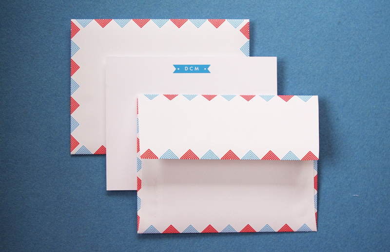 Send your letter on its journey in style with this personalized stationery set. Each set includes thirty-six white cards printed with your initials and thirty-six modern airmail envelopes.Each card measures 5.5" by 4.25" and is digitally printed in blue on bright white cardstock; envelopes are size A2 and are offset printed on front and reverse.