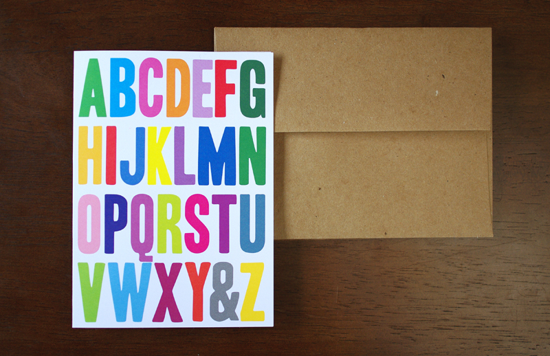 Fill this card of letters with your own words and sentences. Each set includes twelve multicolored folded cards and twelve kraft brown envelopes. Each card measures 5.5" by 4" and is offset printed on premium uncoated cardstock. Designed and printed in the great state of California.