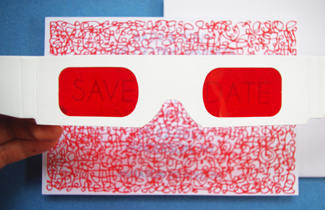 Old-fashioned whimsy. A hand-drawn pattern obcures save-the-date information. Included red decoder glasses reveal the hidden text. Fonts and layout are all customizable.