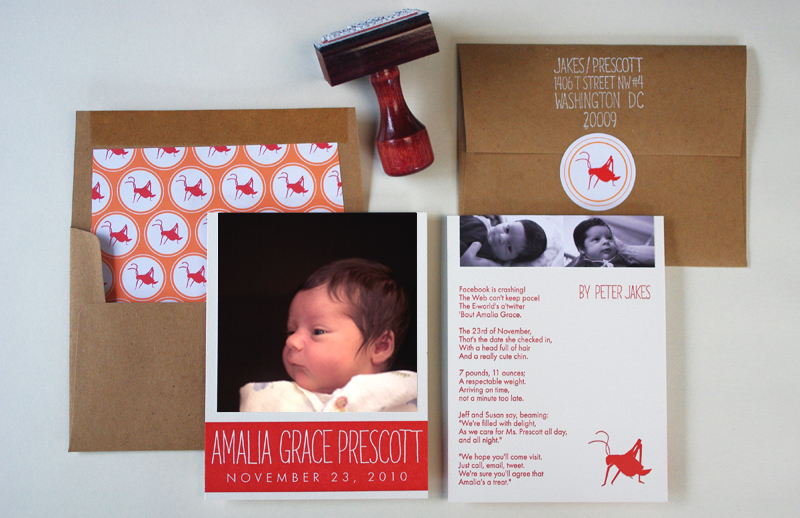 This handcut pop-up card celebrates the arrival of a little bundle of joy. The bright green and pink card is hand-mounted on pink cardstock for an extra pop, and the main card is accompanied by a registry note and a placecard featuring a favorite quotation of the mother-to-be