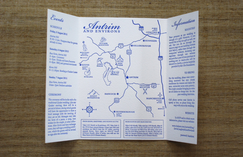This suite includes a fabric-backed invitation card, a custom map, a reply card, a schedule, and a website card, along with orange and fucshia envelopes. The couple requested a fun and modern invitation, so we used a wide range of colors, fonts, and motifs to create an eclectic set of paper goods for this beautiful country wedding.