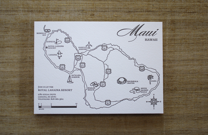 This wedding map shows the entire coastline of the Hawaiian island of Maui, and includes wedding venue information as well as major tourist destinations.