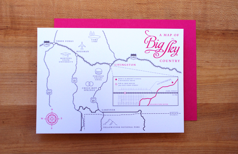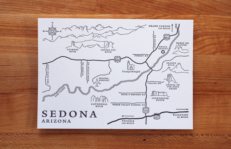 Designed in conjunction with the talented couple, this map locates the major geological formations surrounding Sedona as well as the locations of wedding events.