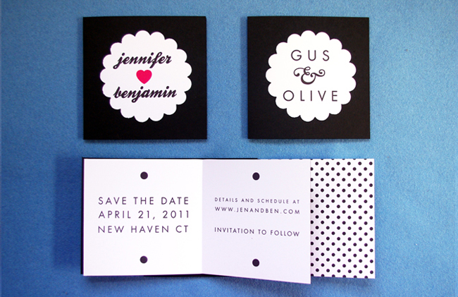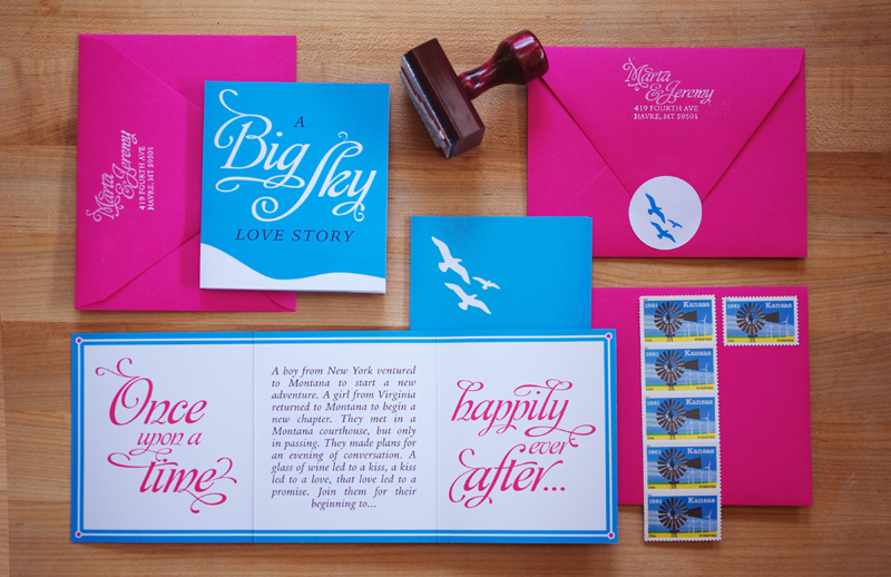 Designed for a couple in Montana, this sky blue tri-fold card opens to reveal the story of their love. The invitation features a bird motif, symbolizing the new family. Contrasting fuschia envelopes are addresed with a custom rubber stamp.