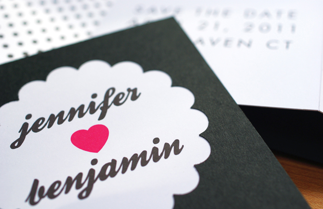 Short and sweet. A window is die-cut into a colored outer card to reveal the couple's names. Inside the card, the event information is printed on the pages of a small book.. Fonts, layout, and colors are all customizable.